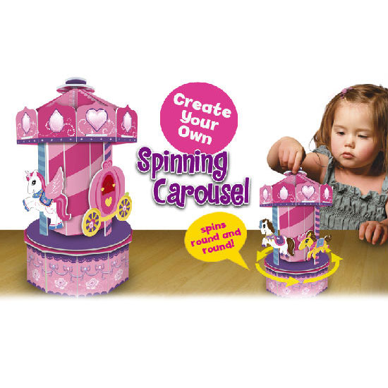 This spinning carousel comes with a pink finish. The toy set includes an easy assembly kit with pre-cut foam board components for children to assemble the carousel with ease. The construction enables you to turn from the top and make the carousel spin.