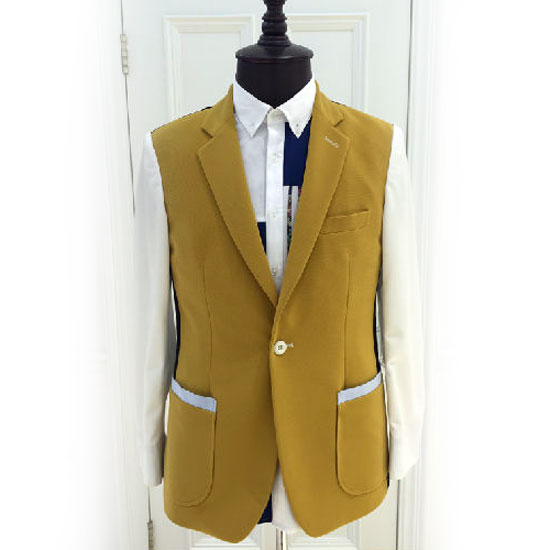 This split joint fashion suit comes with a 2-toned design in brownish yellow and white. It is fitted with 3 pockets for practical use. The one-button closure ensures easy clothes changing.
