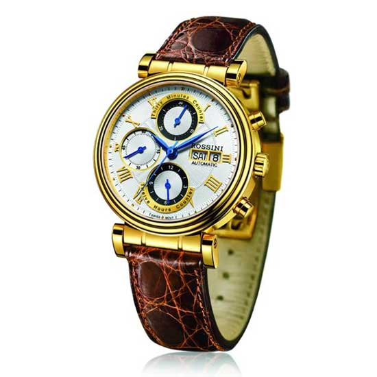 This wrist watch comes with a sporty dial plate, golden and tasteful, adopting ETA7750 auto-winding clock mechanism. The delicate case is matched with dark brown crocodile skin watchband. The complicated dial provides second and minute indication, date, week display and 12-hour timing function.