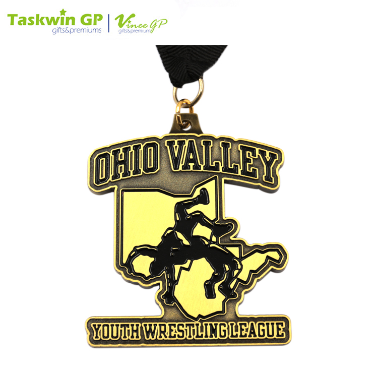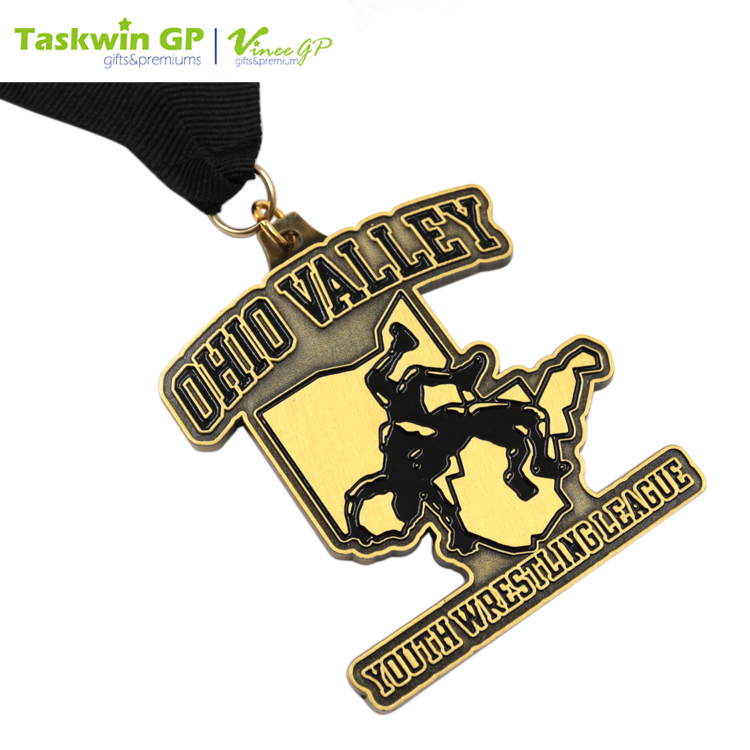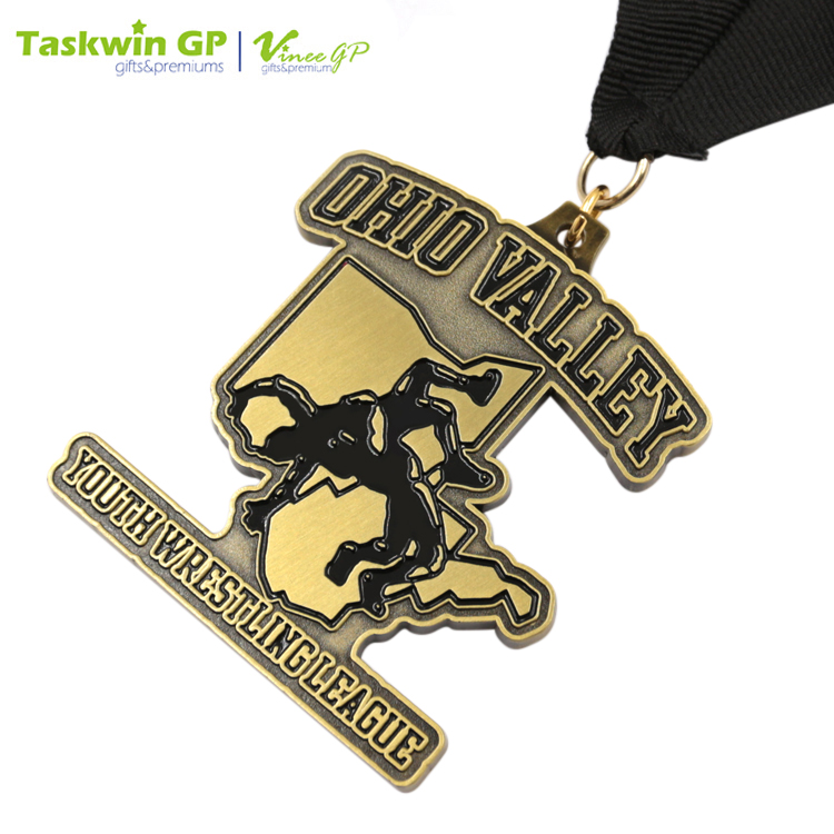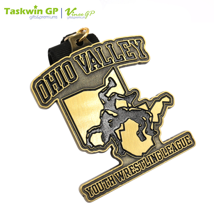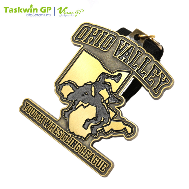 This die-cast zinc alloy medal comes in the design of a wrestler doing the German suplex move. It has an antique brass plated exterior and comes with a neck ribbon for wearing. The medal is available in customized designs and is ideal as an award for wrestling and other sports events.