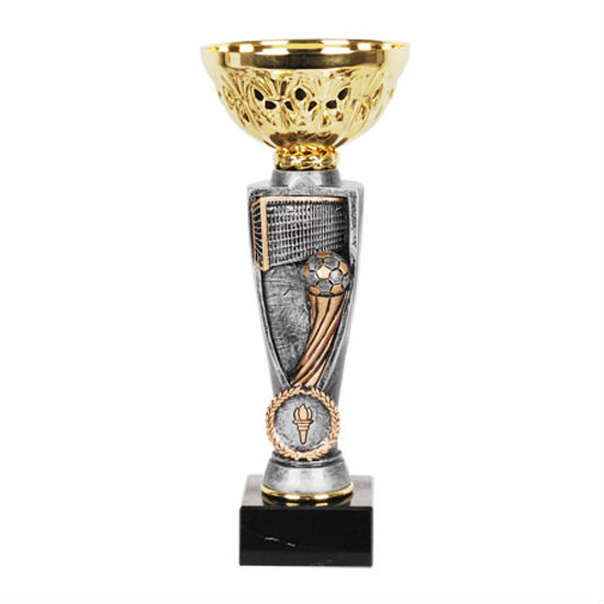 Reward the best soccer team in the upcoming competition with this superior trophy. The riser of this trophy is made in an antique silver-tone and terrifically engraved with a soccer goal net and a shoot soccer ball signifying your brilliant soccer skills. Built on a supportive base, this trophy will still be your pride after years.