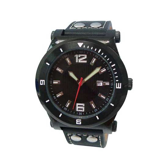 This black sports watch named Volley features a round dial with stick hour and minute markers and luminescent hands. The date display window lends extra functionality to the timepiece. The stylish and practical quartz analog watch is finished with a matching black strap with white stitched details.