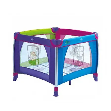 This square aluminum playpen features attractive drawings on each mesh panel and the mattress. The quilted bumper pad promises optimum lying comfort. The colorful playpen is designed with a second safety lock system for extra functionality.