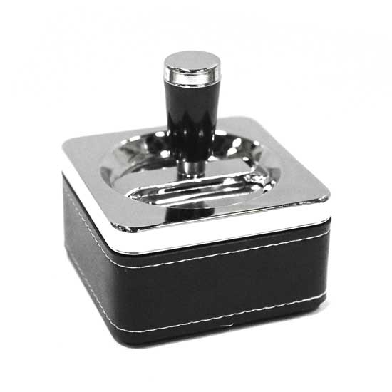 This modern ashtray features a compact, square-shaped body in a black finish. The top-quality ashtray boasts leather and metal construction. It makes a stylish and functional accessory for smokers.