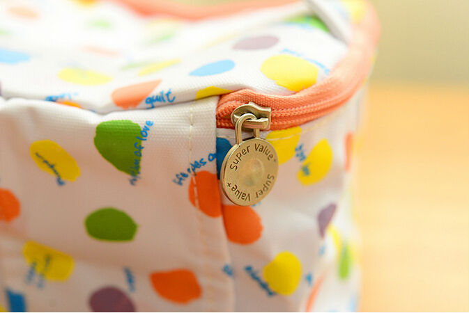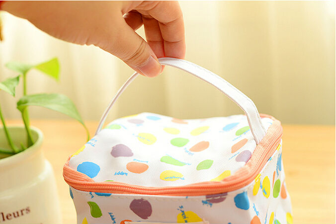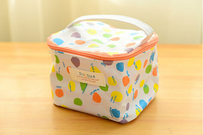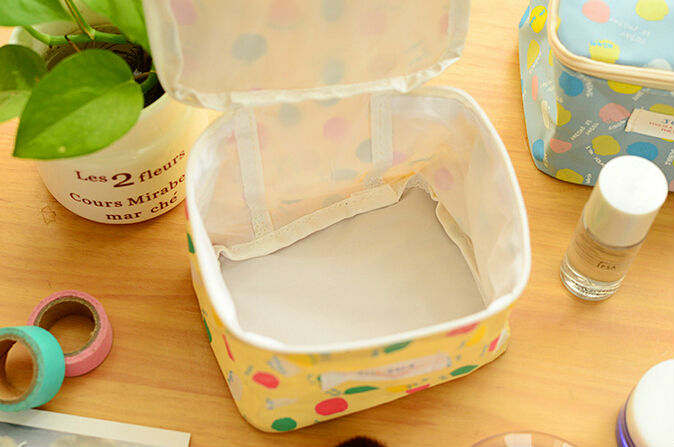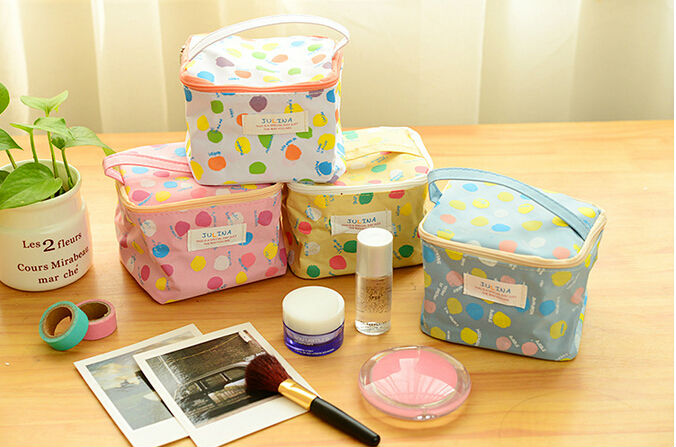Square cosmetic bag displayed is made of nylon with silk printing dot logo