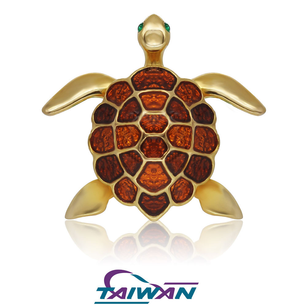 This is a soft enamel pin badge in the shape of a turtle, with a brown tone shell and polished shiny legs and detailing. Perfect as a gift, or for adding to your own pin collection!