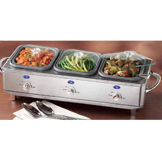This stainless steel 3-station buffet server comes with 3 adjustable thermostats for added functionality. The non-stick aluminium coated surface is durable and easy to maintain. This buffet server is an excellent choice for professional uses.