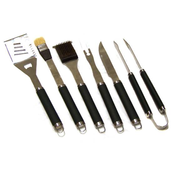 This is a set of stainless steel utensils with handles made of TPR specially for barbecue use. There are six pieces of tools with different shapes for various uses. This barbecue set makes the handling of food more convenient.