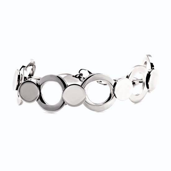This elegant bracelet boasts a stylish design of interlinking circular rings. It is finely polished to reflect a lustrous sheen of glamor. It makes the best fashion accessory to accentuate your look.