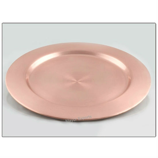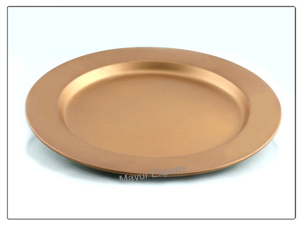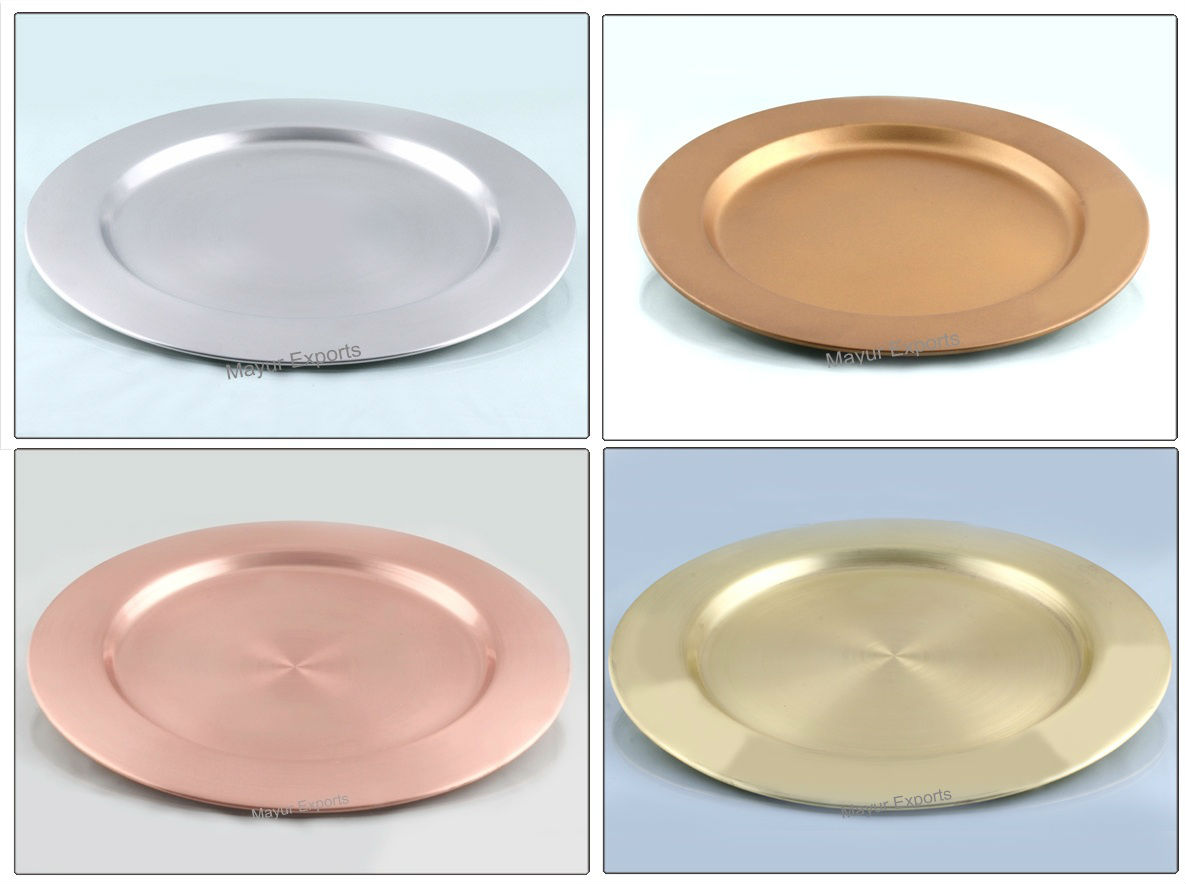 We provide our charger plates in Brass Finish, Copper Finish and in various customized pantone colors.
