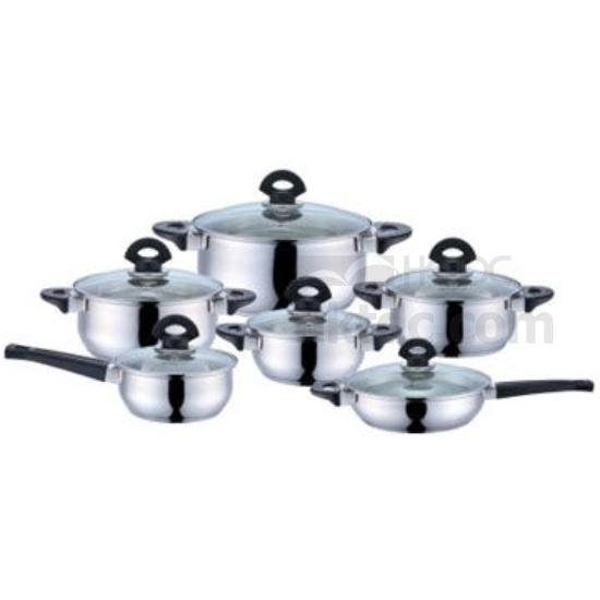 Stainless steel cookware set with saucepan, casserole and fry pan, heat-resistant bake lite handles, transparent glass lid for easy view while cooking, thick aluminum core in the bottom for good heat distribution
