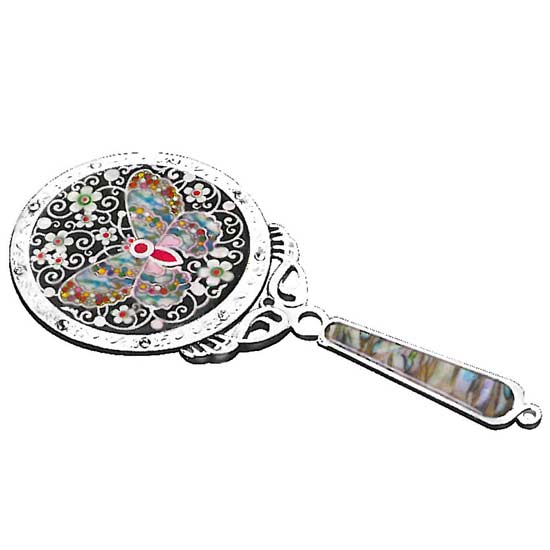 The cosmetic mirror features a stainless steel frame highlighted by vivid mother of pearl. The ergonomic long handle provides superb carrying comfort for users. This pretty cosmetic mirror makes a great gift idea for fashionable ladies.