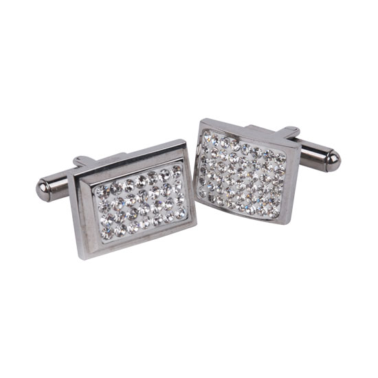 Displayed is a pair of fashionable stainless steel cufflinks coming in a rectangular shape. It is encrusted with shiny polished CZ stones for an alluring touch. This pair of sparkling cufflinks adds spice to your look easily.