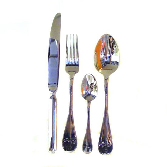 This stainless steel cutlery set includes a knife, a fork, a big spoon and a small spoon. They have interestingly simple design and flat pear shaped handle. They can add a little glamor to your dining table.