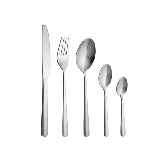 This flatware set contains 30 pieces to serve 6 persons. The knives, forks and spoons are designed in an elegant curved shape. The burnished surface makes a perfect finish to this flatware set.