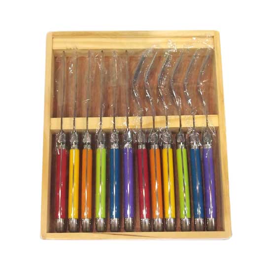 This is a flatware set constructed from stainless steel. The ABS handle in an eye-catching color highlights the design easily. This classy flatware set showcases your noble taste.
