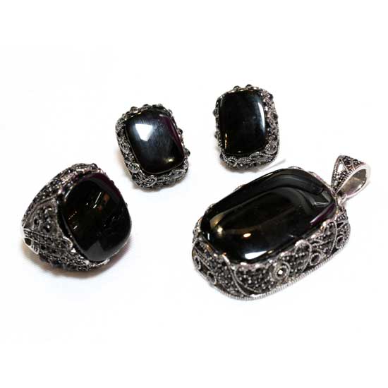 The 4-piece jewelry set includes a ring, a pendant and a pair of earrings. All jewelry item feature stainless steel adorned with CZ stones. The edges of the jewelry pieces are paved with filigree patterns for a decorative touch.