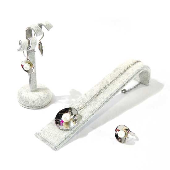 Highlighted here is a stainless steel jewelry set in a simple yet stylish design. Each of the jewelry pieces is accented with a well-polished round pearl at the center, showcasing a beautiful touch. The stainless steel jewelry set is perfect for ladies who are interested in understated and delicate pieces.