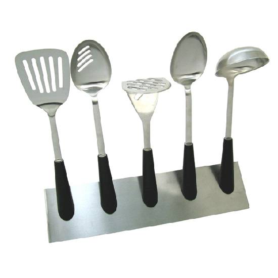 This is a five pieces stainless stell kitchen tool set. This kitchen tools set can be put in a holding stand or put them on wall as they have holes on the plastic handle. These tools are durable and easy to clean.