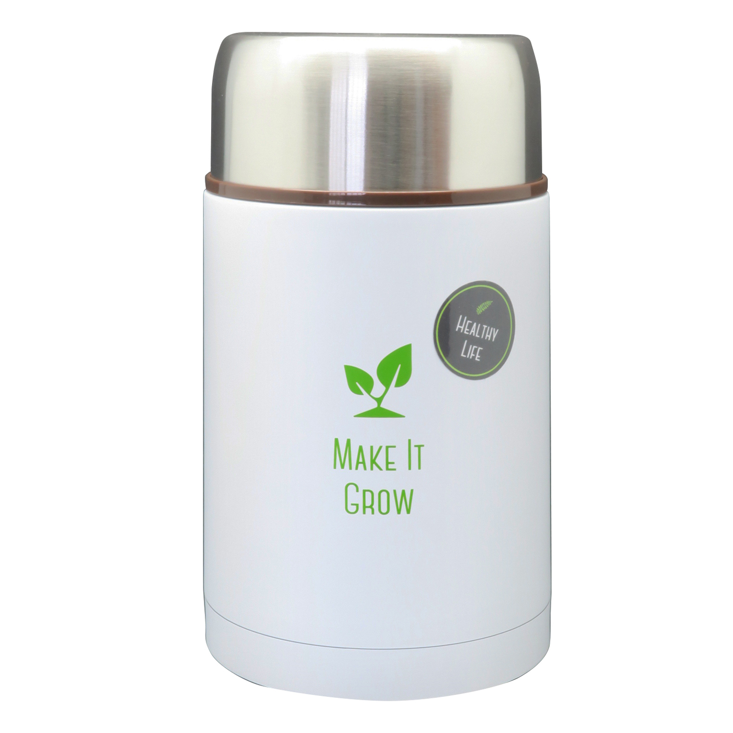 Stainless steel vacuum food jar with stainless steel folding spoon.