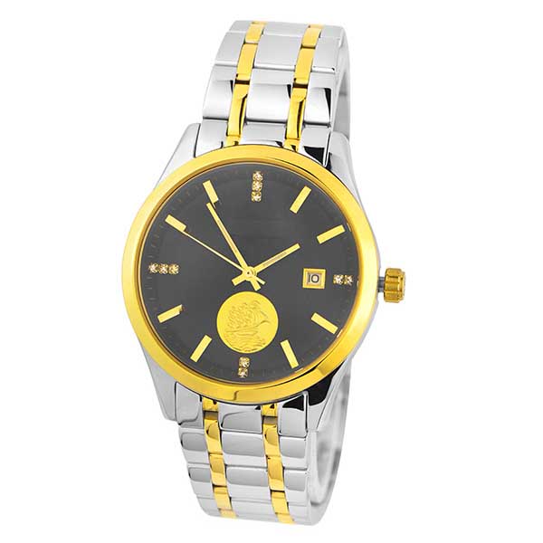 Stainless steel with gold plating, black dial