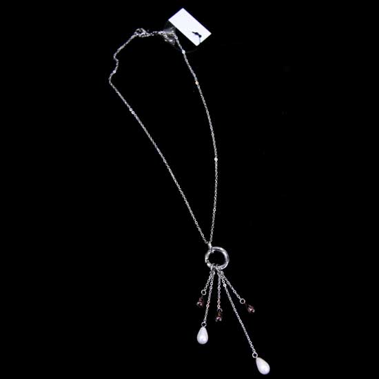 The stunning dangling stainless steel necklace features a silvery hoop hanging down several strings with white shell pearl and purple electric-coated stainless steel charms. This gorgeous necklace comes with a lobster clasp. The unfettered design matches youthful dress-up.