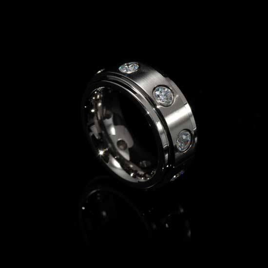 This ring boasts a trendy design with simple lines. The slender band shows delicate details in the nice edges and the embedded shiny stones. The surface is finely polished to make it a glittering accessory.