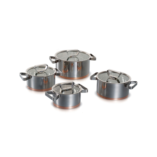 These four sauce pots flaunt their copper base with quadrangle handles. The lid handle adopts the same trapezium shape to maintain consistency. The copper base gives you the exceptional quick heat-conducting.