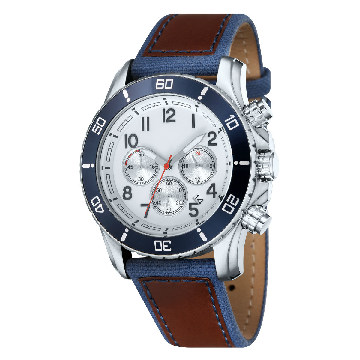 This laidback-looking chronograph watch comes without skimping on performance. The 60-minute marked bezel encases a 3-eyed analog dial with Arabic time index, offering a legible presentation for reading the time precisely at a glance. Mixing canvas and leather overlays, this watch adds some texture to any plain ensemble.