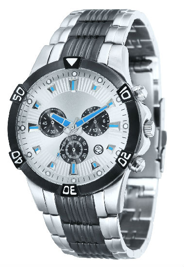 Presented is a Swiss Chronograph watch configuring with a durable stainless steel case and a secure deployment bracelet. Comprising of a circular silver-toned dial, the dial is matched with three black round sub dials and an easy-to-read date calendar window, with the addition of light blue-toned hour markers and three hands for a brightening touch. This watch is installed with a turning bezel with numbers engraved in ten-minute increments and the link bracelet is delicately designed with two-toned stainless steel to create a fancy touch.