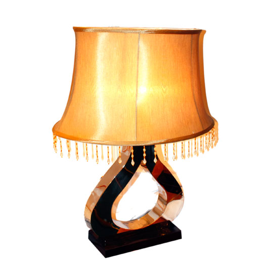This stainless steel table lamp features a decorative lamp shade with hanging bead adornments. A curvy metallic lamp base in drop-shape flaunts an urban touch. This fancy lamp delights any room immensely.