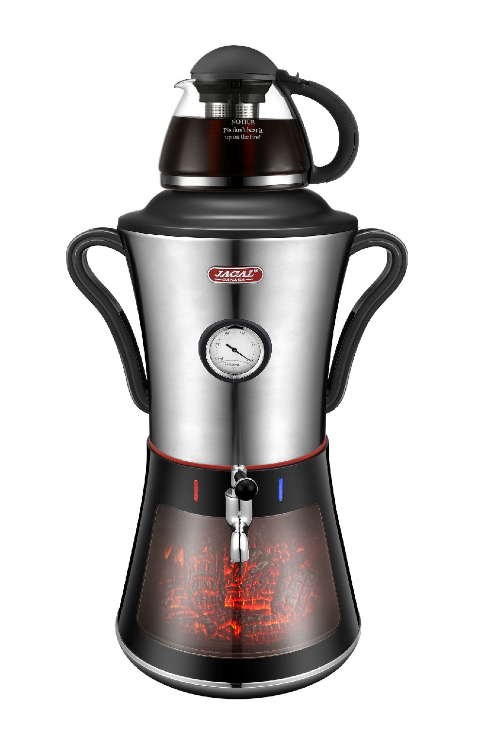 220-240V 1950-2300W 50/60Hz Concealed S/S heating element Keep warm and auto switch off functions Boil dry & overheat protections Boiling and keep warming indicators Unique metal faucet Elegant teapot Removable & washable S/S filter in the teapot Patent Thermometer Patent Fireplace Panel