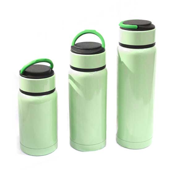 This is a series of vacuum office mugs in assorted sizes. They are made of high-quality stainless steel for added durability. Each piece is designed with a light green exterior for a fresh and neat touch.