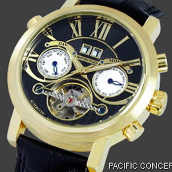 This refined stainless steel watch boasts a round dial with Roman numeral markers and two sub-dials to tell the day and month. This extravagant analog watch comes with golden markers, hands as well as the bezel, expressing timeless yet modern essence.