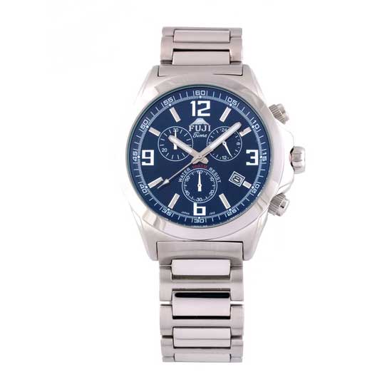 This exclusive stainless steel watch boasts a round bi-color dial of blue and white, with Arabic numeral hour markers. This awesome chronograph watch goes with three functional subdials and a calendar display, keeping one in speed everyday.