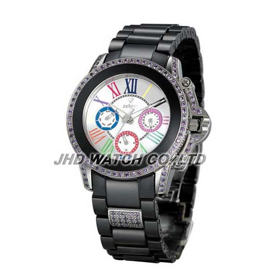 This analog watch grabs your attention with its colorful roman numeral hour markers and three sub dials. The bezel and the case are adorned with shiny stones for an attractive touch. This high quality wristwatch is sure to make you look more impressive.