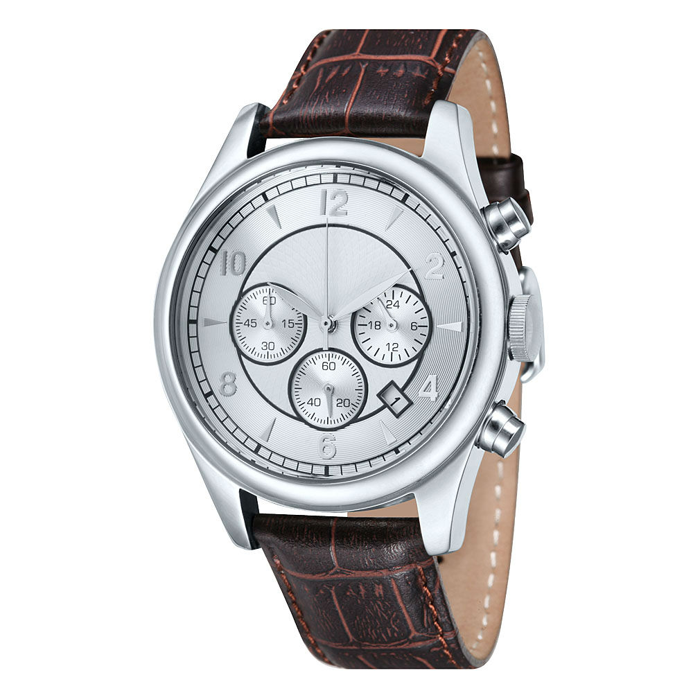 Complement your everyday look with this stainless steel analog watch. It has a structural dial with UP indexes and is equipped with a Japan chronograph movement to ensure good precision. This stainless steel watch has three eyes to provide stop watch functions and comes with a genuine leather strap for comfortable wearing.