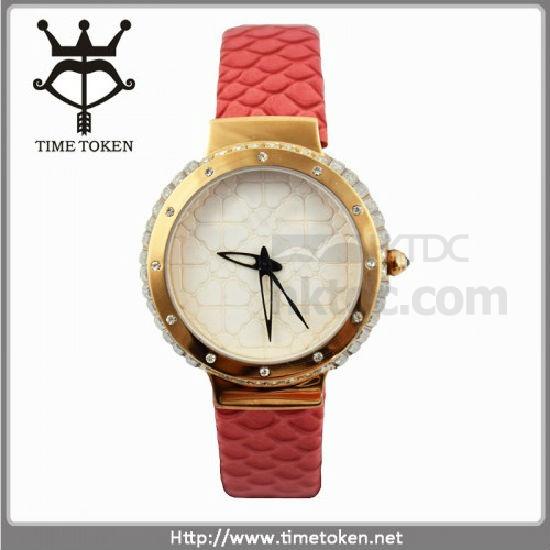 Featured here is an analog watch with a solid stainless steel case in round shape and a buckled watch band. It has an IPG plate bezel with glued stones and is decorated with four-leaved clover patterns on the dial. This watch is 3-5ATM water resistant and delivers accurate and reliable performance.