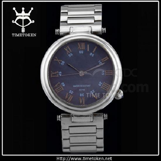 The displayed wristwatch has a round purple dial and shows the time with Roman numeral hour indexes and Arabic numeral minute and second indexes. It has a solid stainless steel case with IP-rose gold plating and is paired with a stainless steel band. This stainless steel watch offers reliable time keeping and is excellent for complementing your outfits.