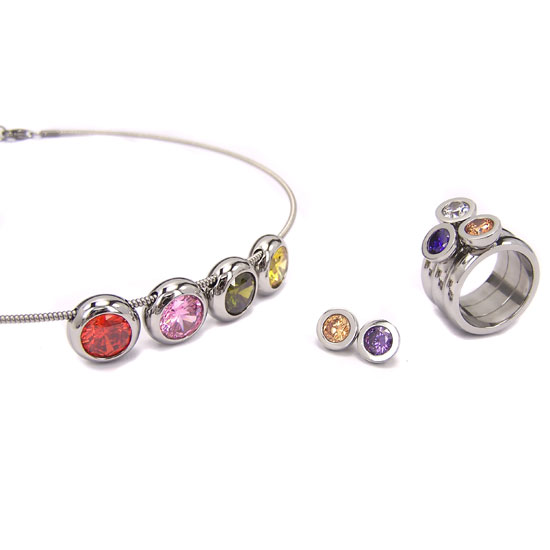 This exclusive costume jewelry set includes a necklace, a ring and a pair of earrings. The jewelry is crafted of stainless steel and accented with round brilliant CZ stones. The colorful jewelry set will add a lively touch to any casual outfit.