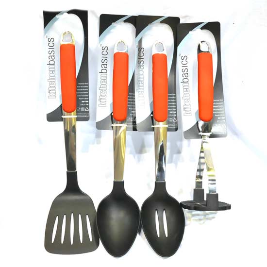 The kitchen set includes the essential cooking tool for a delicious meal. The spatula comes with openings that provide drainage when working on greasy dishes. With the contemporary designs and orange handles, these cooking tools will bring a splash of color to your modern kitchen.