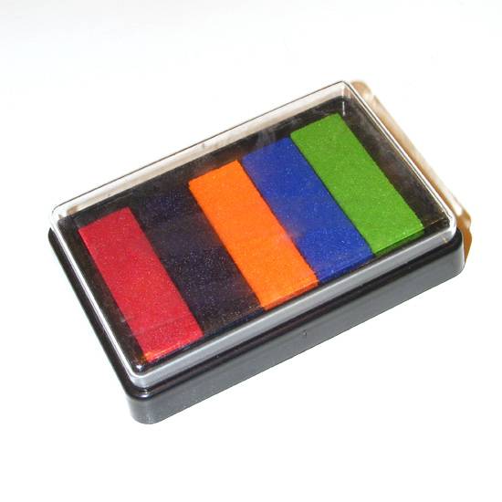 This is a colored ink pads for small stamps and chops. They are available in five colours, such as red, black, orange, blue and green. It is contained in a black plastic case with a transparent lid.