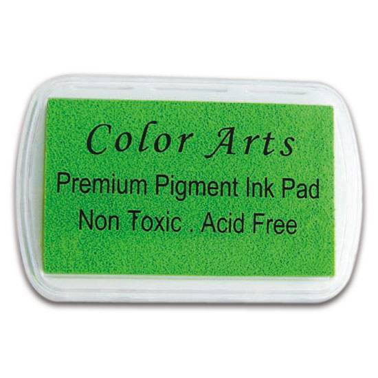 This is a stamp pad which is retangular in colour and is put in a clear plastic casing. The stamp pad is green in colour.