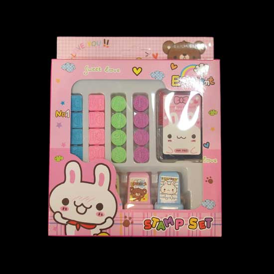 This stamp set consists of red and blue ink and 20 stamps. It features a rabbit motif with irresistible cuteness. This lovely stamp set makes an ideal gift for your little girl.