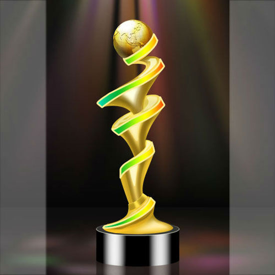 The standing trophy is marked by its whirl design. It features a globe decoration on top. This piece stands stably with a round black base.