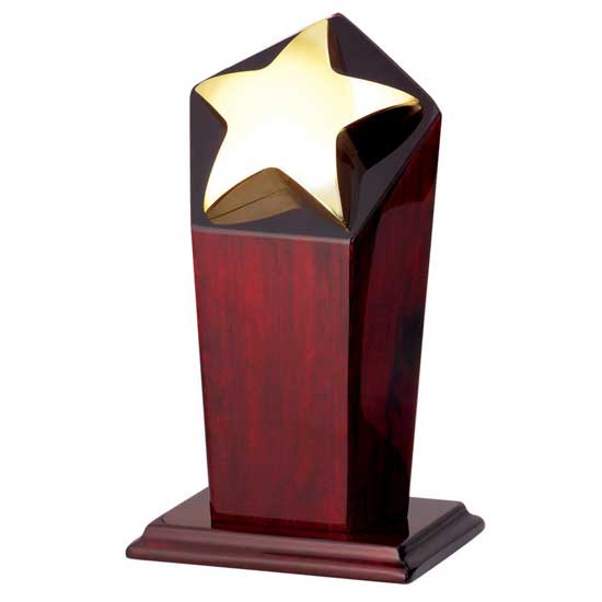 Displayed here is a wooden trophy with an elegant design. It is embellished with a golden star ornament for added glamor. This wooden trophy is a great choice for display use.