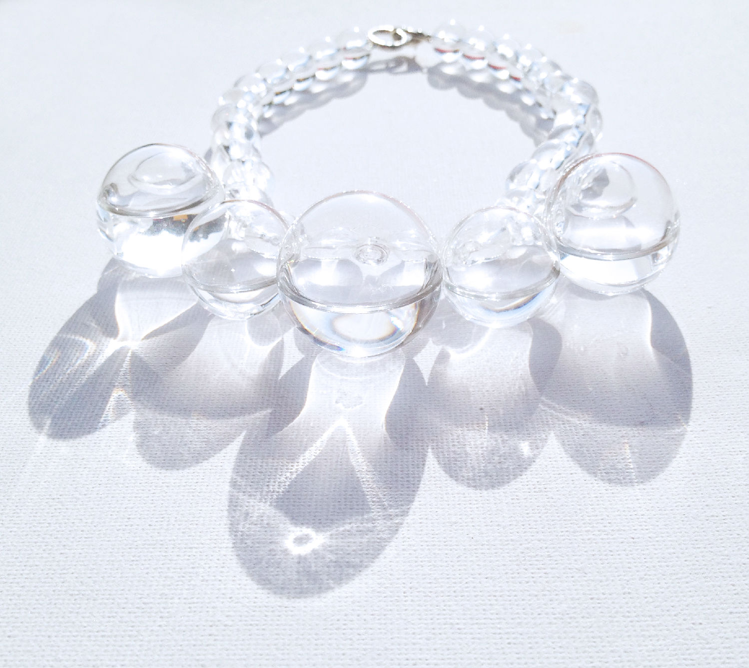 A bunch of sphere shape glass pedant with water inside ,hand blown glasswork made of clear borosilicate glass with tender and carefulness.Other parts are silver.Size of pedant is 3,2.5,2 cm.