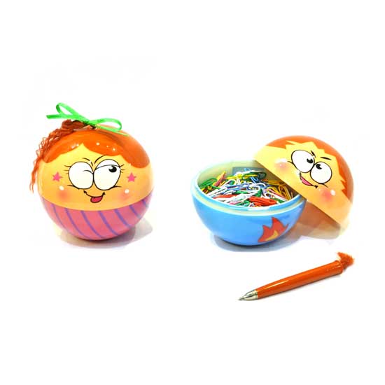 This eye-catching stationery container features a round-shaped body with a cute cartoon face. The plastic container is perfect for accommodating paper clips, erasers and other accessories. The functional stationery container also contains a ballpen inside the body.