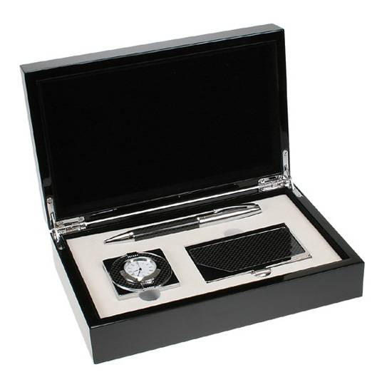 The featured set comes with a retractable ballpoint pen, a small desk clock and a name card holder. It is suitable as a gift set or a souvenir. The set can be used both at home and in the office.