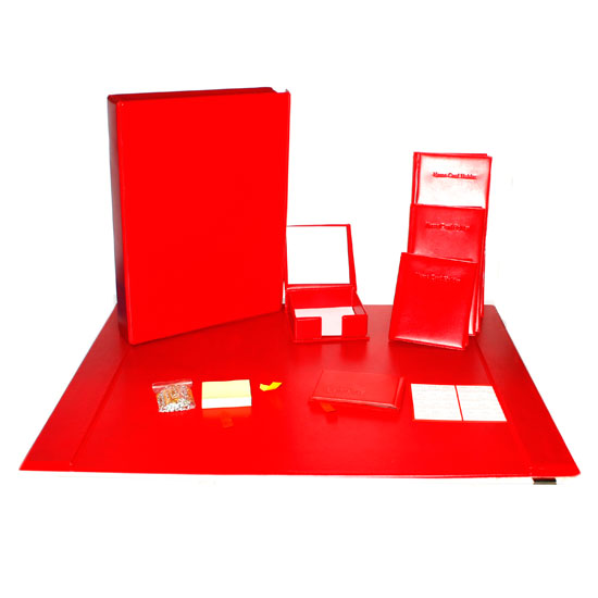 This stationery set comes with a ring binder, a name card holder and a memo box. This user-friendly set features a bold bright red color for a festive touch. This practical, decorative set makes an ideal gift.